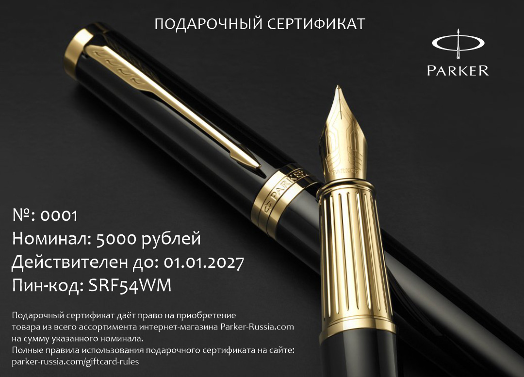 Электронный сертификат гибкого номинала от официального дилера Parker в Череповце. Вы можете дополнительно заказать гравировку, которая подчеркнет Вашу оригинальность и придаст памятность статусному подарку. Все ручки Паркер поставляются в фирменном футляре.